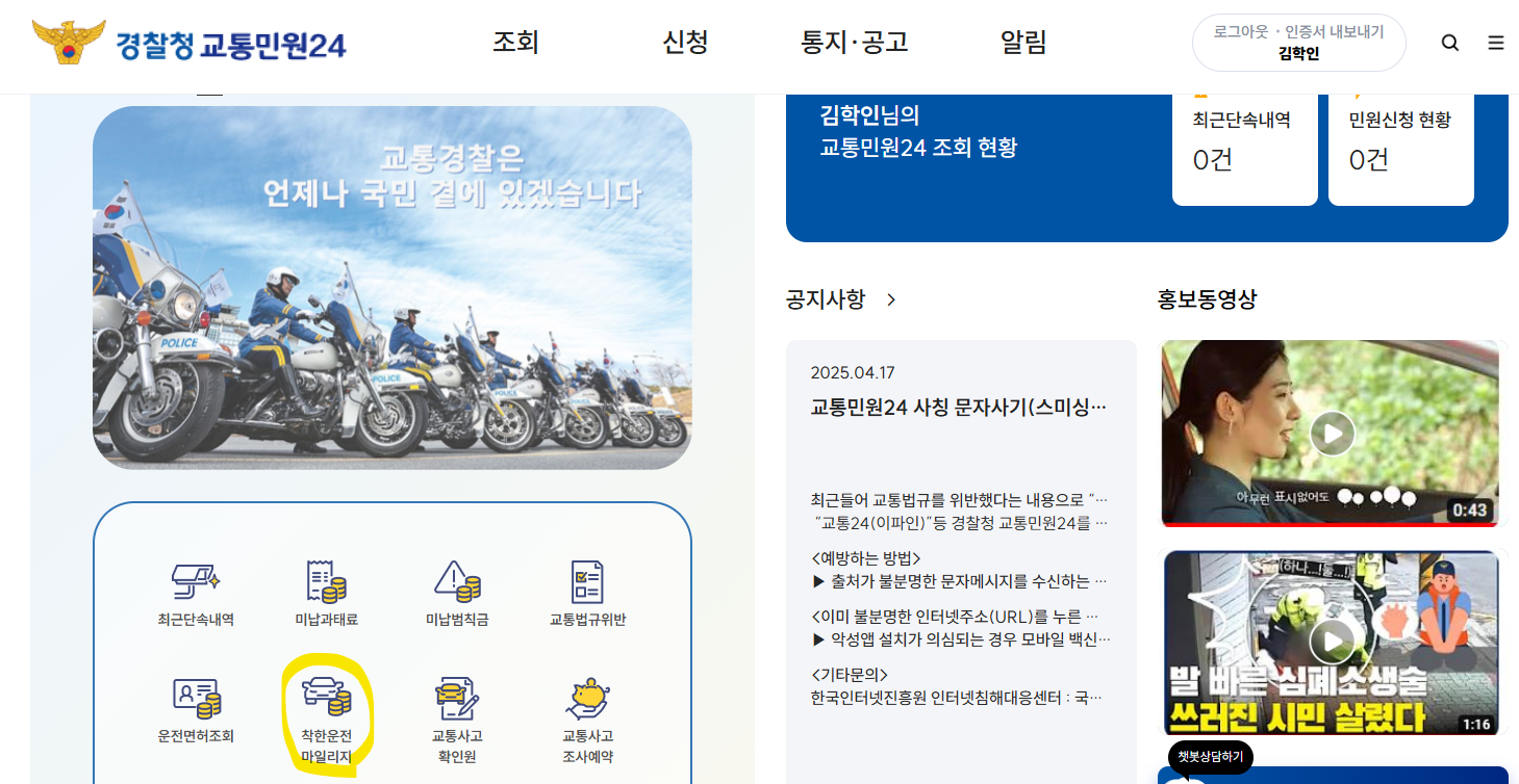 교통법규를 잘지키고 안전운전 하시는 분들에겐 이게 뭐가 필요할까 하지만 순간 실수로 벌점이나 아까운 비용이 나가게 되는 경우가 생길수 있습니다. 이에 정부에선 착한 운전 마일리지를 운용하여 평소 착한 운전하시는 분들이 단 한번의 실수로 피해를 보는게 없도록 하고 있습니다. 신청하는데 3분도 안걸리니 바로 들어가서 신청해 보세요~!
